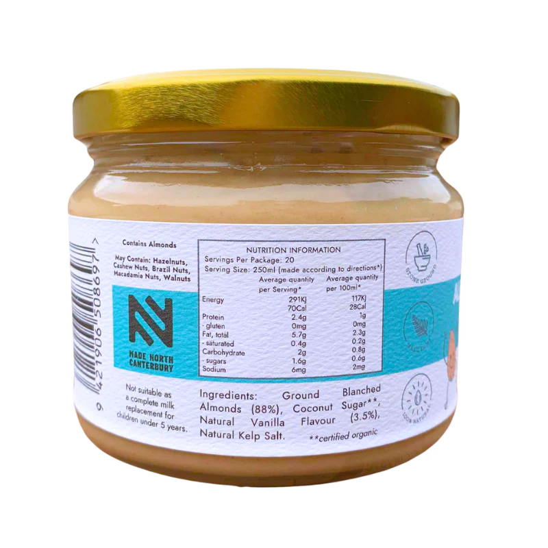 - Ingredients: Ground Blanched Almonds (88%), Organic Coconut Sugar, Natural Vanilla Flavour (3.5%), Natural Kelp Salt.