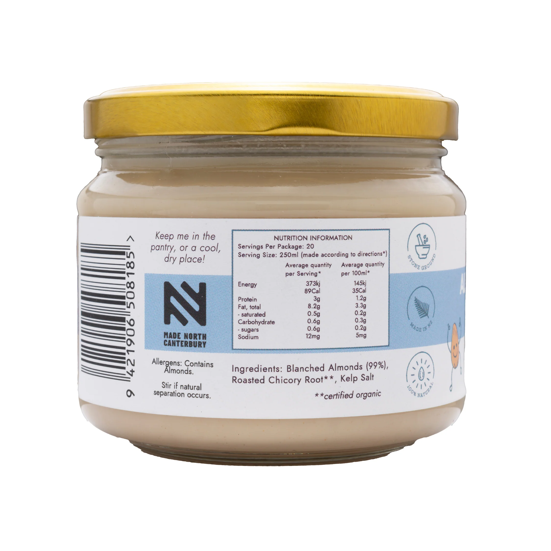 - Ingredients: Blanched Almonds, Organic Roasted Chicory Root, Natural Kelp Salt