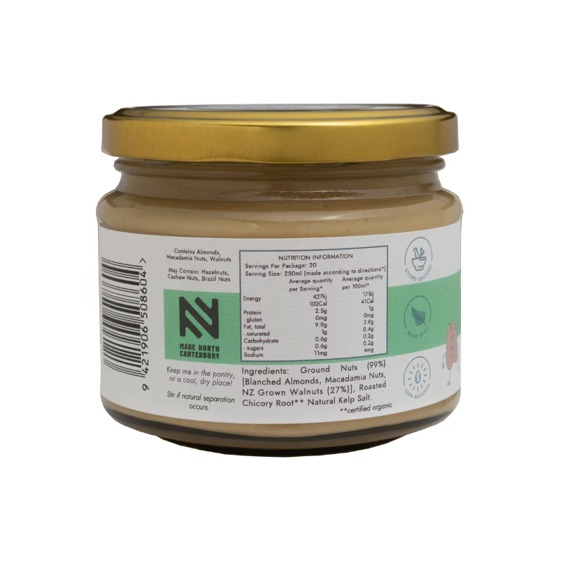 - Ingredients: Blanched Almonds, Macadamias, NZ Grown Walnuts, Organic Roasted Chicory Root, Natural Kelp Salt